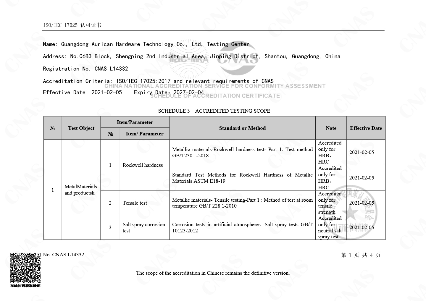 The testing center of Guangdong Aurican Hardware Technology Co., Ltd. is affiliated to Guangdong Aurican Hardware Technology Co., Ltd.The testing center was accredited by China National Accreditation Service for Conformity Assessment (CNAS) in February 2021, certificate number : CNAS L14332, which demonstrates that Aurican Testing Center is incomply with CNAS-CLO1 Accreditation Criteria for the Competence of Testing and Calibration Laboratories and equipped the technical ability to carry out testing services in accordance with the internationally recognized standards.It is a milestone that the testing capability and quality management system of Aurican Testing Center has stepped onto a new level, with a new platform and a new height.