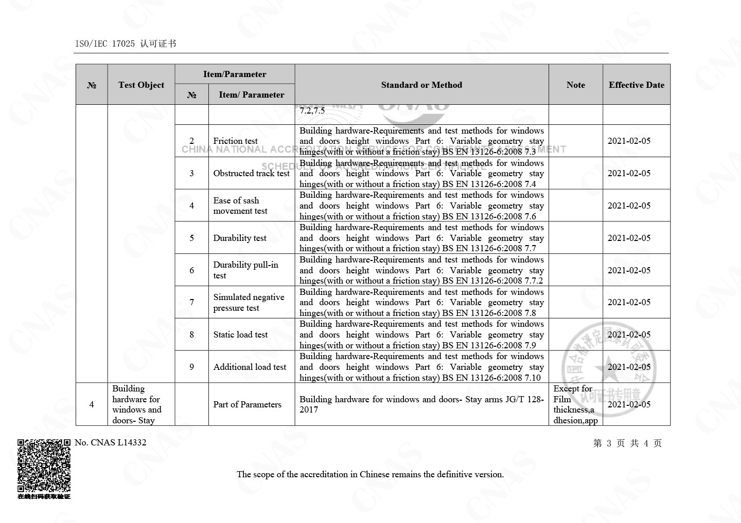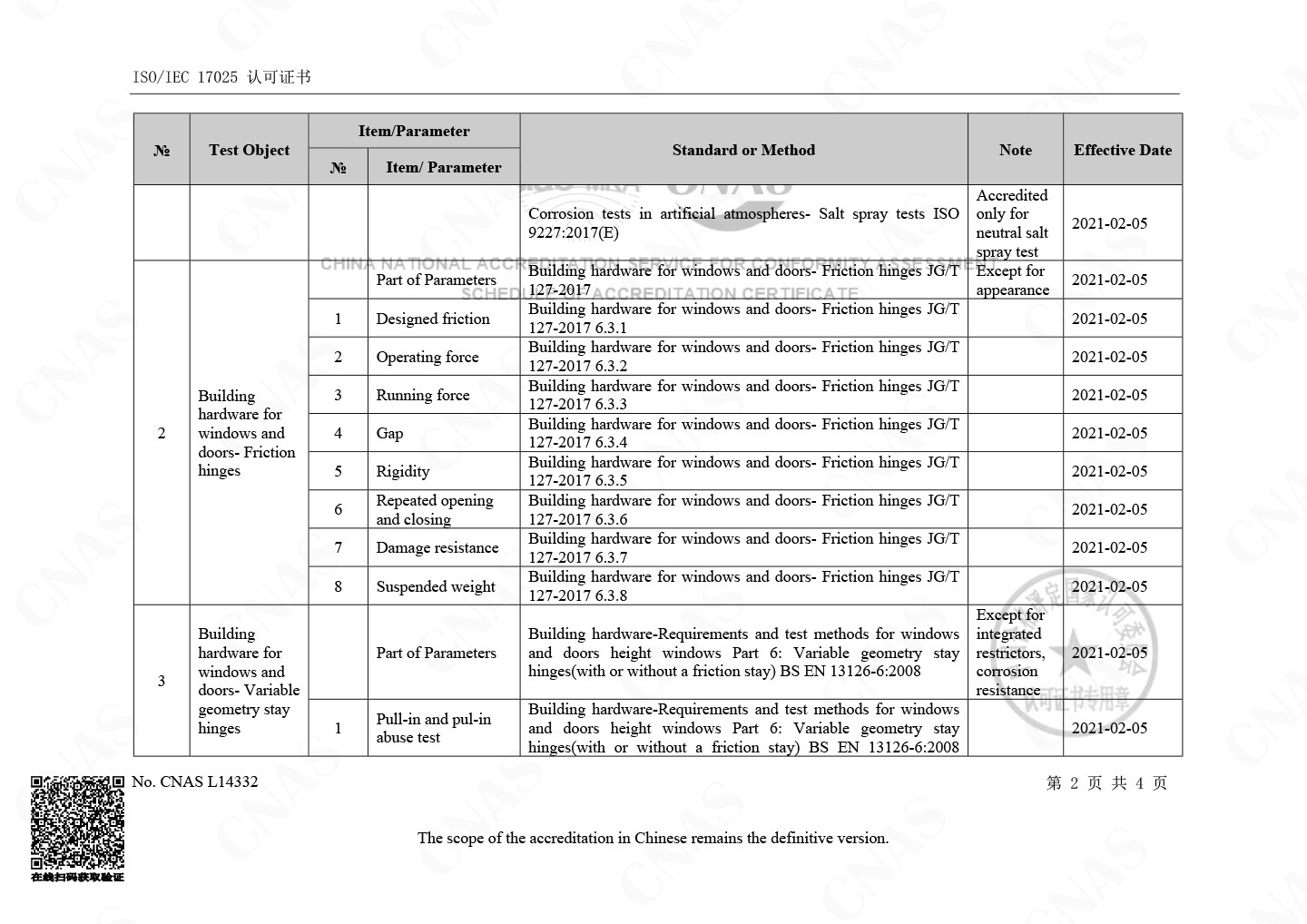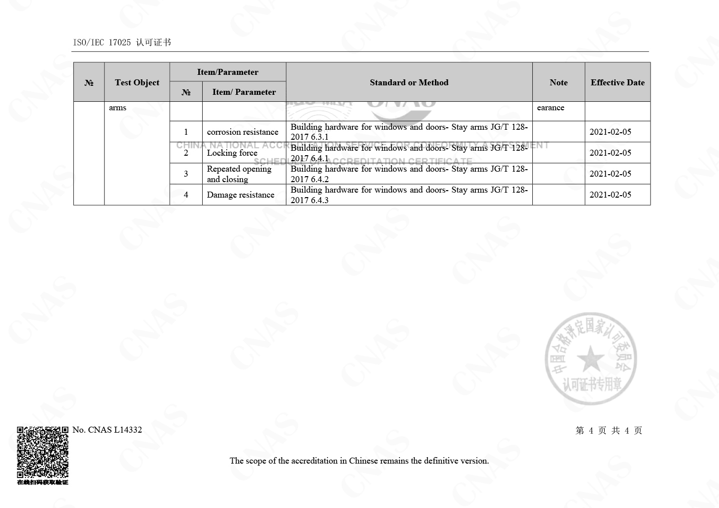 Aurican Testing Center gathers series of the mechanical and physical performance testing for building window & door hardware friction hinges, support arm and metal materials. The verified testing ability includes 4 testing objects and 23 testing items. There are 7 staffs in the testing center, including 1 senior engineer, 1 doctor, and 5 personnel with junior college degree or above, all of which are equipped with many years of technical testing experience and have participated in the drafting and verification of a number of construction industry standards. Aurican Testing Center possesses stainless steel friction hinge testing machine, electronic universal tensile machine, Rockwell hardness tester, precision salt spray testing machine, electronic analysis scale testing equipment and etc, which fully meet the approved testing capacity in the range of testing items.